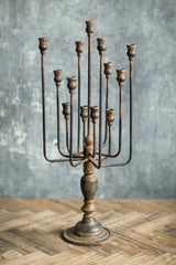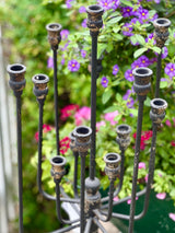 If you are looking for that dramatic statement piece, look no further. This gorgeous dark bronze metal candelabra will light up your table, outdoor patio, countertop or entryway with inimitable candle light and star power. With thirteen holders at different heights, this spectacular piece signals a special evening ahead! Beautiful and stately when not in use as well.