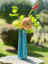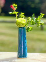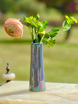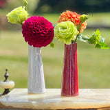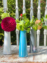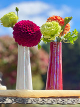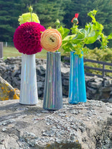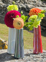 An easy favorite. Let these slim sturdy ceramic flower vases adorn your sills, mantels and bedside tables with opalescent shine, rich color and whimsy. These rich shimmering beauties hold their own alone or group them together for even more fun. Just add seasonal blooms, berry branches, rosemary sprigs or pine!