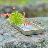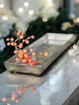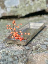 Grab a touch of sophistication with our new aluminum rectangular valet tray in raw nickel. This shiny, slightly textural plate boasts a festive silvery patina and makes a great bedside jewelry tray, desktop organizer, entry table key holder or platform for showcasing your favorite treasures and curiosities. And a gracious surprise in the guest bedroom with a vintage ornament and sprig of pine or winterberries.