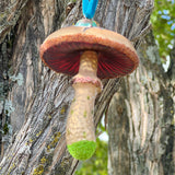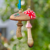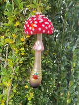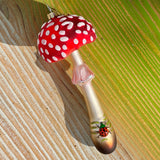 Indulge in these two fantastic fungi with the merriest details. The red spotted toadstool features a lady bug, fibrant color and a dash of sparkle. The brown mushroom has a rich deep red underside and a blue beetle on top. Fun and whimsical, these heirloom glass ornaments are perfect for friends, hostesses, teachers and you!