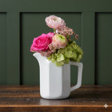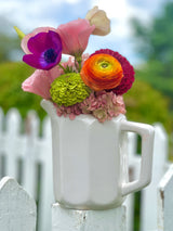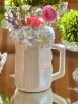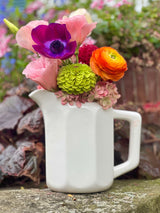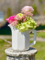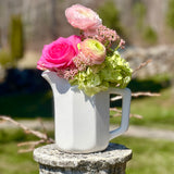 Let this creamy white ironstone pitcher be of service! Love it for serving cream or fresh squeezed orange juice, or love it for arranging bouquets straight from the garden. Or both! A beautiful addition for any spot or occassion, this pretty pitchervase will make you happy over and over again. A thoughtful gift for the gardener, home curator or special mom!