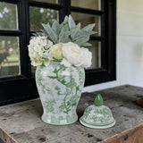 Making a bold statment as stand alone pieces, these lidded vessels also make stunning vases showcasing blooms on the mantel, entryway table, shelves and sideboards in your thoughtfully appointed spaces. Flaunting joyful stylized flora and fauna imagery in a lush green hue, give these elegant temple jar pride of place to celebrate the arrival of Spring and life in the garden all year long. We especially love two together!