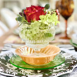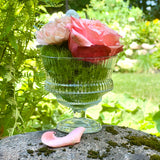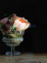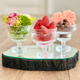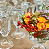Luminous and elevated with a playful spirit, these pretty footed bowls are perfect for crudités, desserts, nuts, dipping sauces, puddings, signature cocktails and tabletop bouquets. Formed of heavyweight pressed glass with ribbed detailing, each versatile pedestal coupe glass bowl is ready to impress.