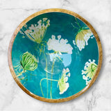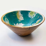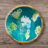 This strong and durable mango wood serving bowl with enamel finish features her whimsical white and green Queen Anne's Lace stems against a bold blue green background. Beautiful on the counter with fruit, in service at the table or on the coffee table as a striking decor piece. A perfect gift for mom, special friend or your favorite newlyweds.